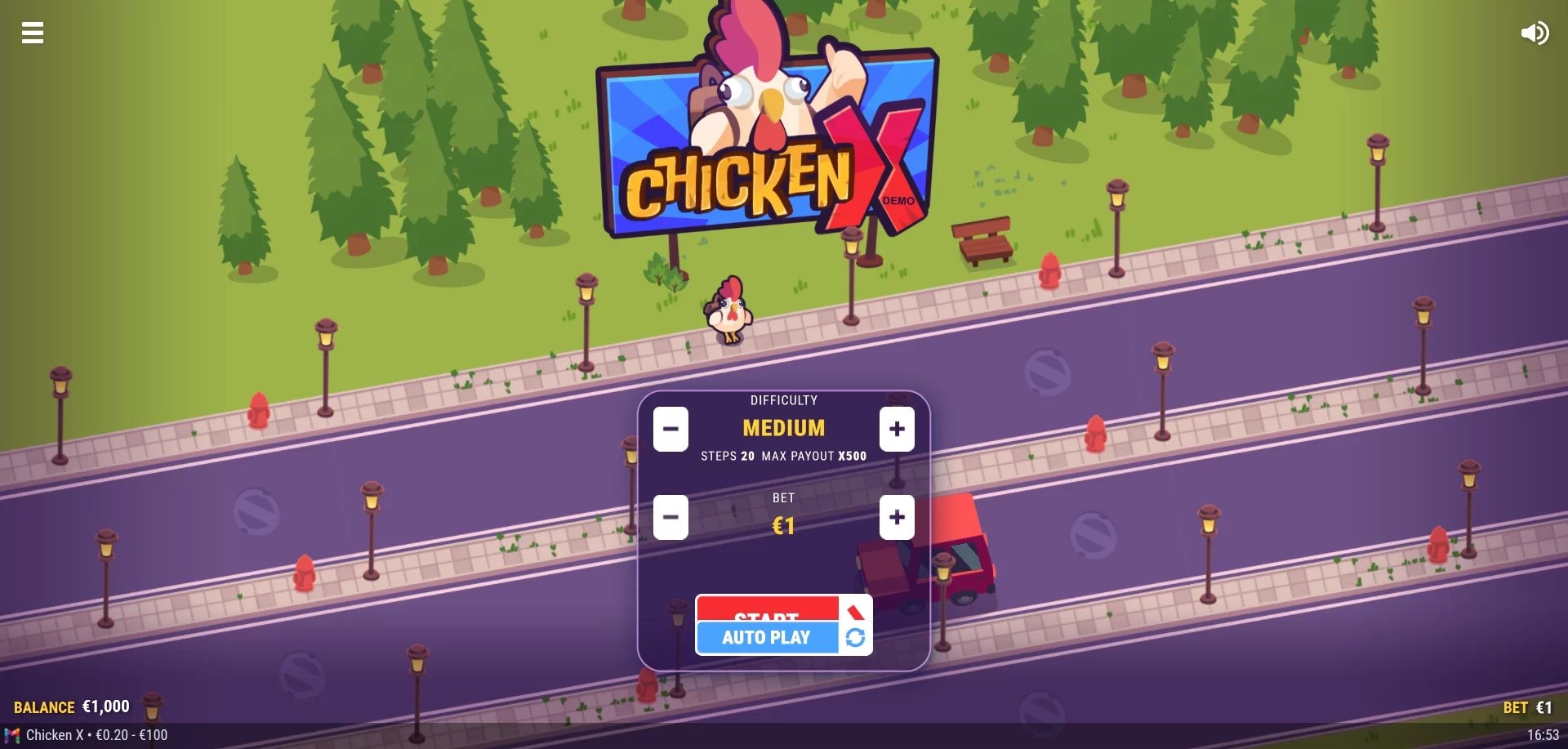 Chicken X pakub lühimängu, kus osalejad suunavad oma tegelast - kartmatut kana - läbi ohtlike takistuste. Mängu eripära peitub põnevas pingehoos, kus iga valik määrab võidukäigu. Mängijad alustavad panuse paigutamisega, käivitavad vooru ja jälgivad, kuidas kana otsustavalt edasi jõuab. Tegevuse arenedes kasvab pinge kiiresti, millal võtta kasum maha - õige hetke valik on otsustav!